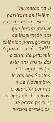 Retomando a expressão artística do Presépio, nas suas diferentes variantes, Mecenas, Ordens Religiosas e Militares, igrejas, confrarias, a devoção popular... incentivaram a produção e feitura de presépios, a partir do século XVI, a devoção ao Menino Jesus, desenvolvendo-se “o culto do Presépio” (portugueses e espanhóis deram enorme incremento, dentro da sua acção missionária). Inúmeras naus partiram de Belém, carregando presépios que foram motivo de inspiração nas colónias portuguesas. A partir do século XVIII, o culto do presépio está nas casas dos portugueses (as feiras dos Santos, 1 de Novembro, proporcionavam a compra de “bonecos” de barro para os nossos presépios). Portugal, o Alentejo, é terra de barros, matéria dúctil para a feitura de peças desta natureza.