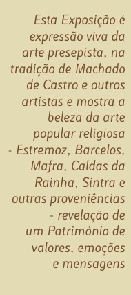 Esta Exposição é expressão viva da arte presepista, na tradição de Machado de Castro e outros artistas e mostra a beleza da arte popular religiosa - Estremoz, Barcelos, Mafra, Caldas da Rainha, Sintra e artistas de outras proveniências - revelação de um Património de valores, de emoções e mensagens.