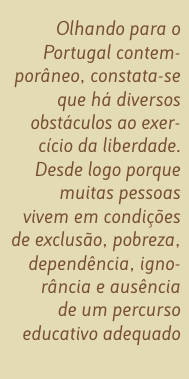 Olhando para o Portugal contemporâneo, o professor universitário considera que há diversos obstáculos ao exercício da liberdade. Desde logo porque muitas pessoas vivem em condições de exclusão, pobreza, dependência, ignorância e ausência de um percurso educativo adequado. Para esta parte da população, a liberdade garantida pela Constituição não pode ser aplicada.