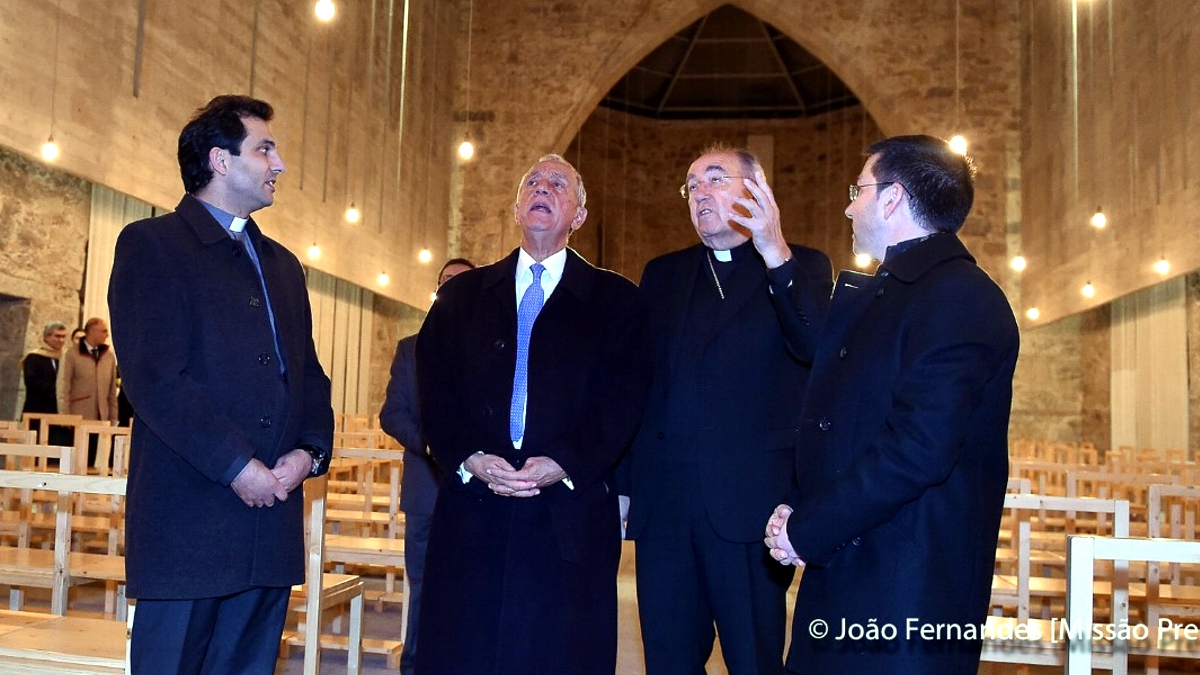 Em seguida, o Prof. Marcelo sentiu-se atraído pelo altar, donde se ouvia o rumor de águas vivas. E, enquanto para lá se deslocava, endereçou algumas palavras de estímulo ao Sr. Arcebispo, a quem muito elogiou pelo arrojo do espaço, nos seguintes termos: «Sr. Arcebispo, os estilos são para a frente!». Este otimismo que carateriza a fé dos cristãos, cuja missão é colocar eternidade no caminho das pessoas, levou-o a perguntar em seguida pelo sacrário, apresentado numa das reentrâncias laterais: obra em filigrana de madeira de tília, com uma árvore da vida em luz, na base, e duas águias esvoaçantes nas portadas, em cujo fecho foi esculpida uma cruz entre estrelas, motivo comum na arquitetura islâmica. Contemplado e tocado o altar, uma pedra em granito negro flutuando sobre água, voltou-se para a instalação Corpo de Luz, em mármore de Estremoz, para admirar a suspensão e a liberdade dessa obra de arte sem molduras, que ultrapassa a simbólica, Cristo ressuscitado que, concentrando a luz no seu corpo, enche de luminosidade todo o espaço.