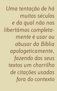 Essa é uma tentação de há muitos séculos e da qual não nos libertámos completamente: usar ou abusar da Bíblia apologeticamente, fazendo dos seus textos um chorrilho de citações usadas fora do contexto e que servem para afirmações de poder ou de doutrina muito parciais.