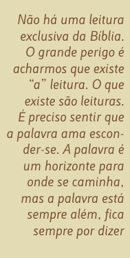 Não há uma leitura exclusiva da Bíblia. O grande perigo é acharmos que existe “a” leitura. O que existe são leituras. É preciso sentir que a palavra ama esconder-se. A palavra é um horizonte para onde se caminha, mas a palavra está sempre além, fica sempre por dizer. A palavra é um interdito. Conseguimos dizer, entre as nossas palavras, a palavra. Muitas vezes, é o silêncio o que melhor traduz a experiência que nós temos da leitura da palavra.