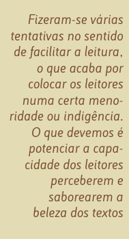 Fizeram-se várias tentativas no sentido de facilitar, o que acaba por colocar os leitores numa certa menoridade ou indigência. O que devemos é potenciar a capacidade de os leitores perceberem, saborearem e compreenderem a beleza de textos que são muito diferentes do modo como correntemente esses leitores falam ou escrevem.