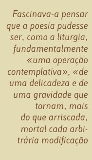 Cerimónia aproximou também poesia e liturgia, Os ritos, explicou numa raríssima entrevista, são «os verdadeiros modelos, os arquétipos da poesia, que é filha da liturgia, como Dante demonstra do princípio ao fim da Commedia. Os mestres da poesia que venero já os nomeei todos, diversas vezes. Mas poder escrever, uma única vez na vida, alguma coisa que recordasse, ainda que longinquamente, a mais simples, a mais humilde das antigas, das eternas liturgias, do Ocidente e do Oriente...». Fascinava-a pensar que a poesia pudesse ser, como a liturgia, fundamentalmente «uma operação contemplativa», «de uma delicadeza e de uma gravidade que tornam, mais do que arriscada, mortal cada arbitrária modificação».