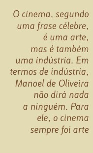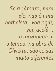 Algumas características exteriores (interiores também, mas isso era outra conversa que não cabe neste texto) apuseram-se ao nome de Oliveira: filmes de enorme duração, filmes estáticos com a câmara fixa em planos com o máximo de duração possível. A lenda não corresponde à realidade. Das suas 30 longas-metragens, incluindo a que está a rodar neste momento, só três (Amor de Perdição, Le Soulier de Satin e Vale Abraão) ultrapassam as três horas de duração. Se a câmara, para ele, não é uma borboleta - voa aqui, voa acolá -, o movimento e o tempo, na obra de Oliveira, são coisas muito diferentes e a incessante movimentação das personagens é a acção que tanto o acusam de não ter. Mas a arte do cinema não foi feita para se olhar, foi feita para se ver, embora poucos saibam ver como Oliveira o sabe. Quem o acompanhar não tem descanso nem parança, como ele próprio a não teve desde os anos 80.