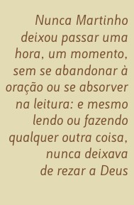 "Os seus feitos, melhor ou pior os pude explicar com palavras; mas a sua vida interior, o seu comportamento de cada dia, os transportes de sua alma sempre virada para o céu, tudo isso, em verdade o declaro, nunca, nunca discurso algum o explicará. Impossível é pintar esta perseverança e esta medida na abstinência e nos jejuns; esta força nas vigílias e nas orações; estas noites consagradas á oração como se dias fossem: estes todos instantes plenos das obras de Deus, sem cuidado no repouso ou nas ocupações, mesmo as da comida e do sono, que apenas as necessidades da natureza obrigavam a satisfazer. Tudo isso, em verdade, nem o próprio Homero se, como se diz, saísse dos infernos o poderia expor: de tal forma é verdade que tudo em Martinho era grande demais para em palavras ser expresso. Nunca Martinho deixou passar uma hora, um momento, sem se abandonar à oração ou se absorver na leitura: e mesmo lendo ou fazendo qualquer outra coisa, nunca deixava de rezar a Deus. Tal como o ferreiro, descansando embora em meio do seu trabalho, bate ainda a bigorna, assim Martinho, mesmo quando parecia fazer outra coisa, continuava a rezar. Ó homem verdadeiramente bem-aventurado! Sem malícia alguma, não julgando ninguém, não condenando ninguém, a ninguém pagando o mal com o mal."