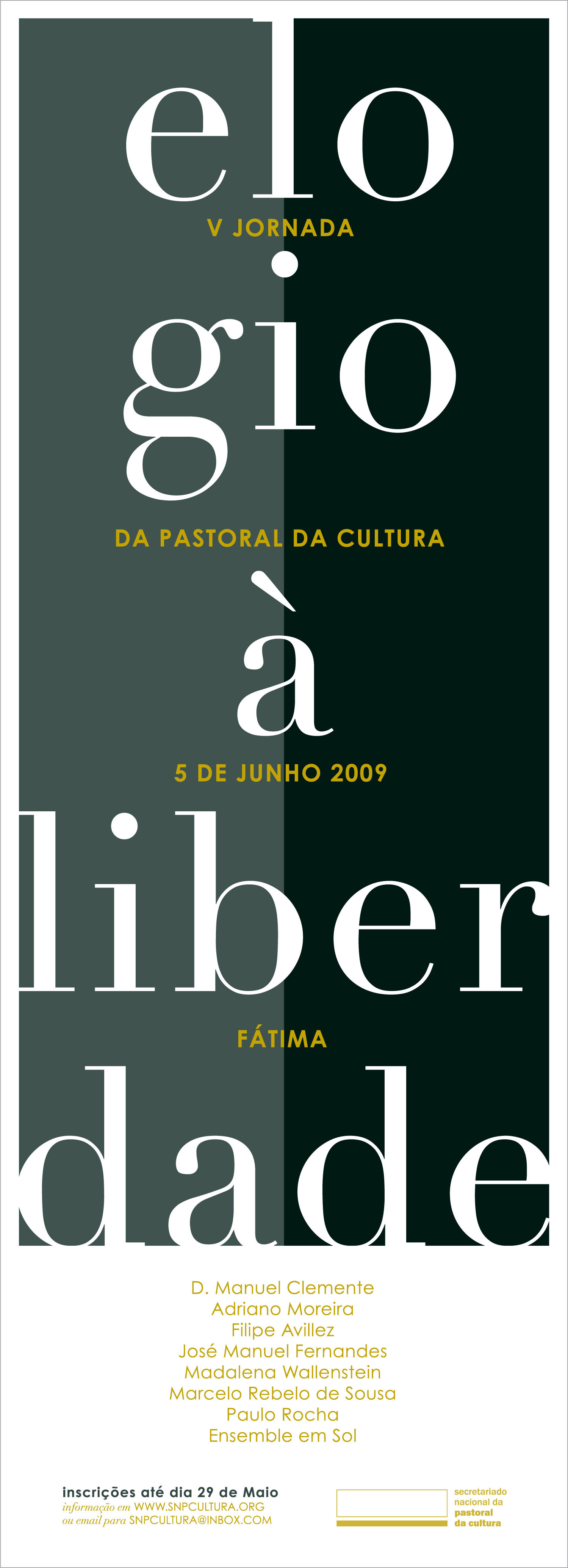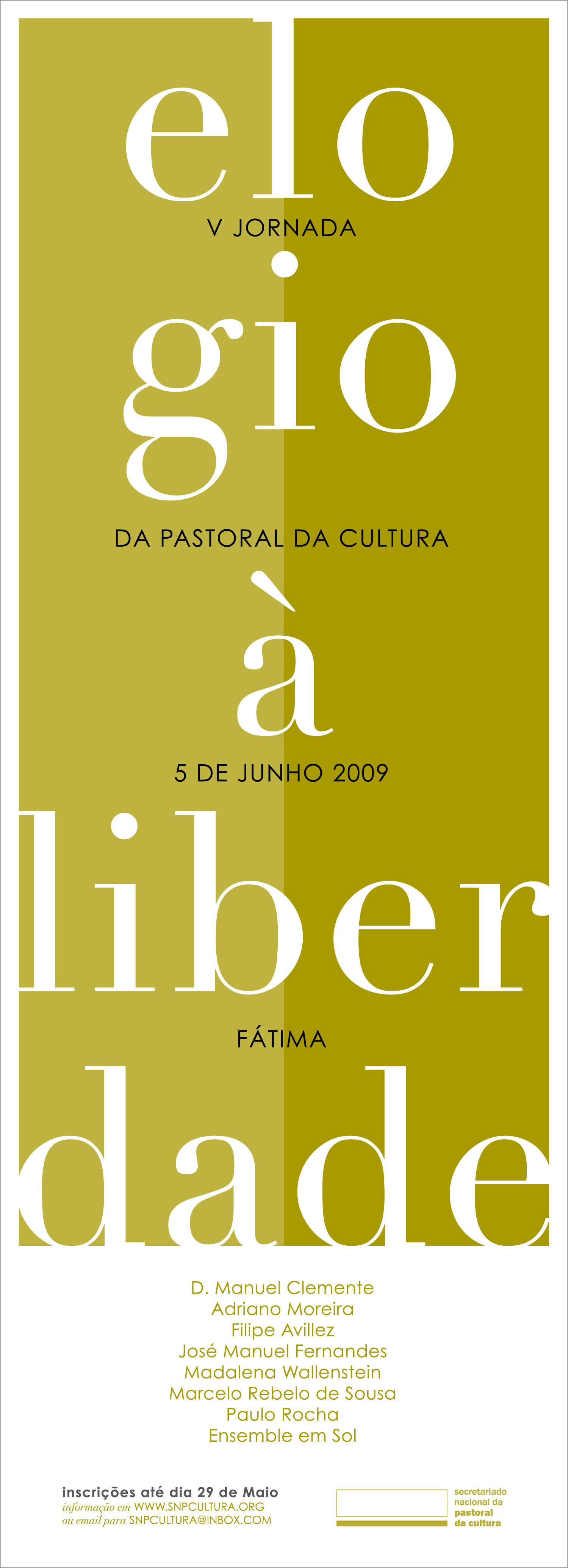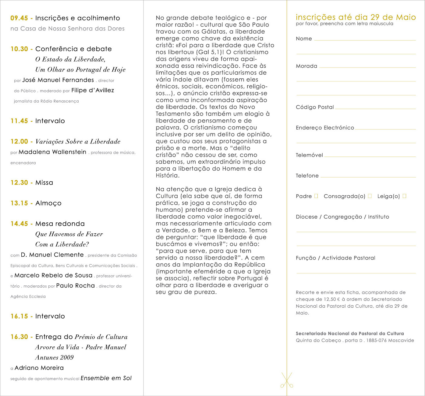 - Preencha e envie o boletim de inscrição por correio postal, acompanhado de cheque no valor de € 12,50 (por pessoa), à ordem do «Secretariado Nacional da Pastoral da Cultura». O endereço para onde deve remeter estes elementos está no desdobrável.