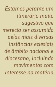 Como se vê, estamos perante um itinerário muito sugestivo que merecia ser assumido pelas mais diversas instâncias eclesiais, tanto de âmbito nacional como diocesano, incluindo movimentos interessados na matéria.