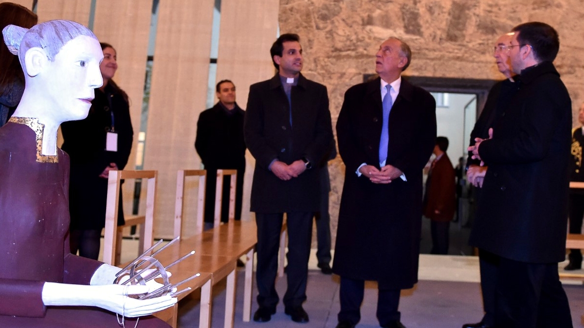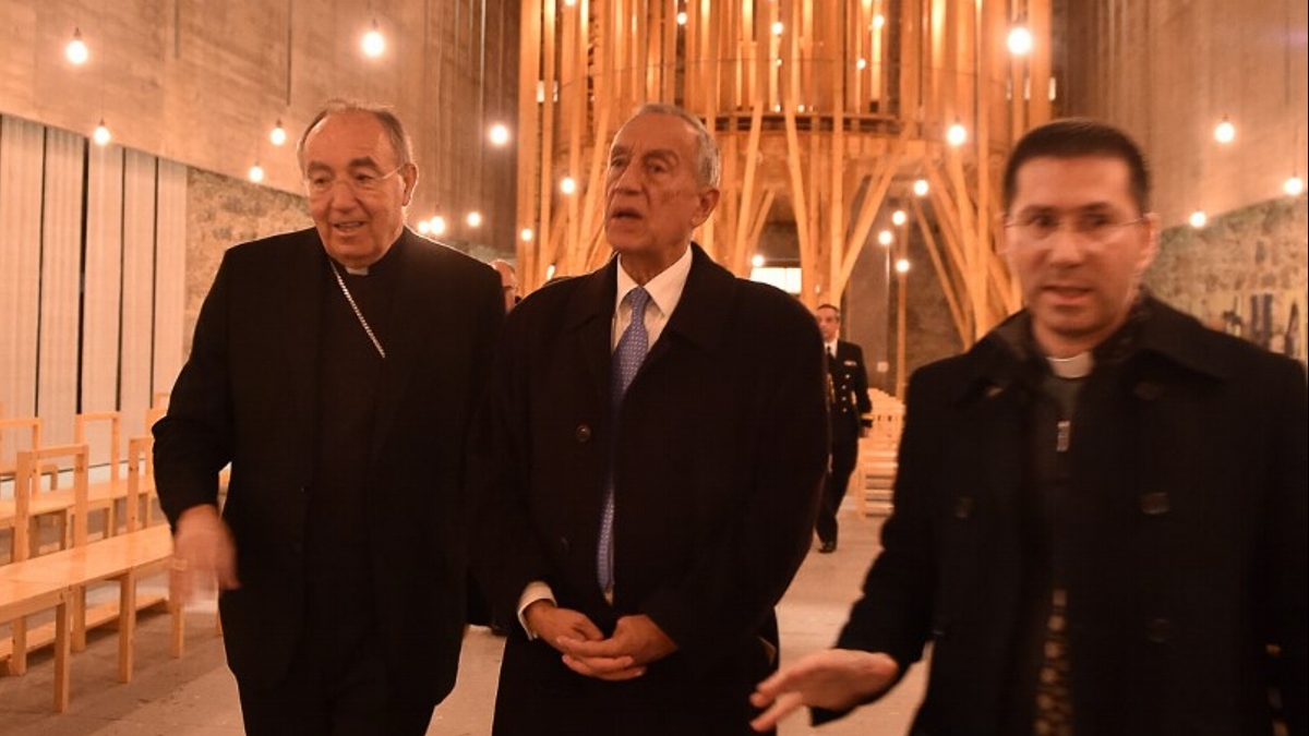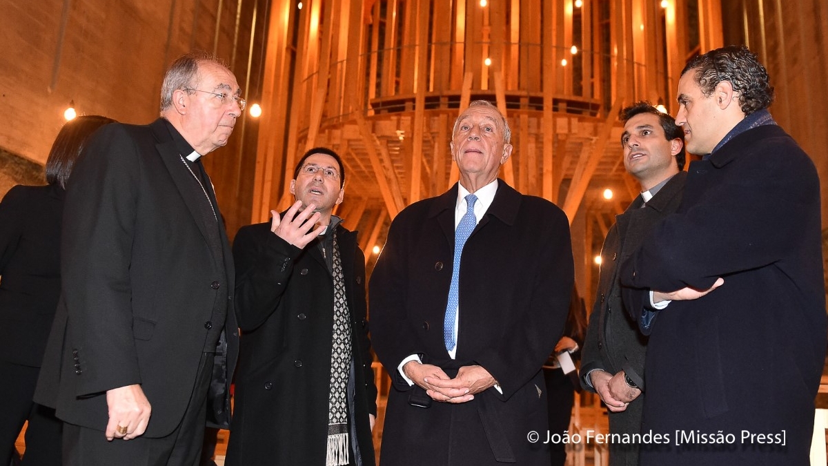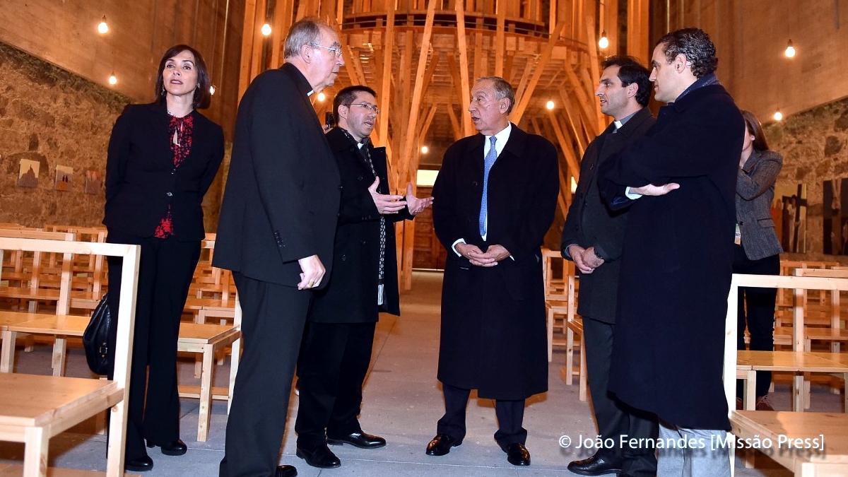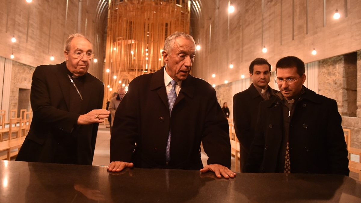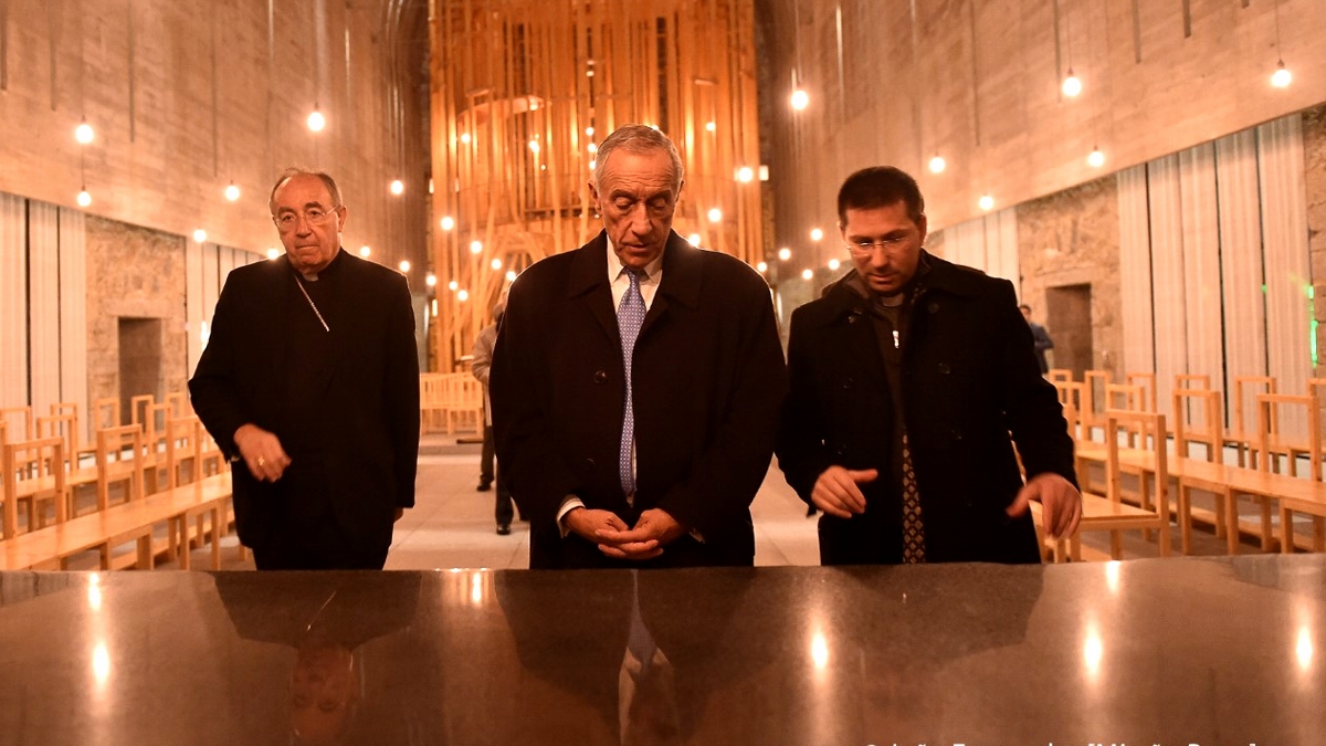 Em seguida, o Prof. Marcelo sentiu-se atraído pelo altar, donde se ouvia o rumor de águas vivas. E, enquanto para lá se deslocava, endereçou algumas palavras de estímulo ao Sr. Arcebispo, a quem muito elogiou pelo arrojo do espaço, nos seguintes termos: «Sr. Arcebispo, os estilos são para a frente!». Este otimismo que carateriza a fé dos cristãos, cuja missão é colocar eternidade no caminho das pessoas, levou-o a perguntar em seguida pelo sacrário, apresentado numa das reentrâncias laterais: obra em filigrana de madeira de tília, com uma árvore da vida em luz, na base, e duas águias esvoaçantes nas portadas, em cujo fecho foi esculpida uma cruz entre estrelas, motivo comum na arquitetura islâmica. Contemplado e tocado o altar, uma pedra em granito negro flutuando sobre água, voltou-se para a instalação Corpo de Luz, em mármore de Estremoz, para admirar a suspensão e a liberdade dessa obra de arte sem molduras, que ultrapassa a simbólica, Cristo ressuscitado que, concentrando a luz no seu corpo, enche de luminosidade todo o espaço.