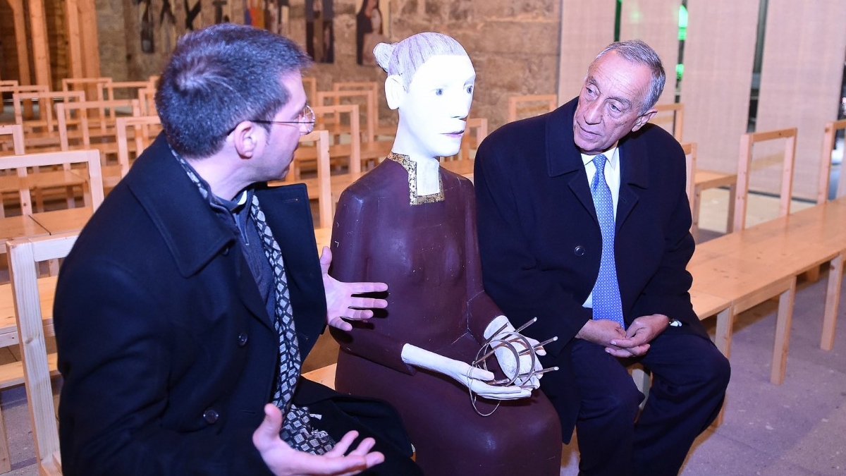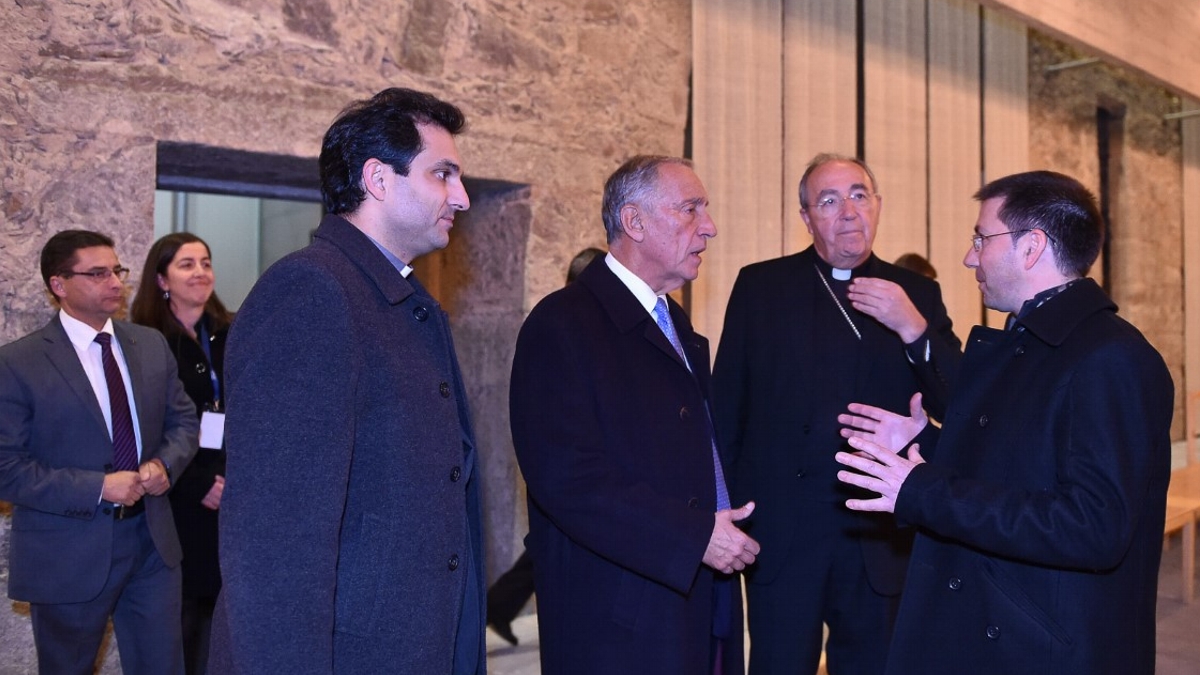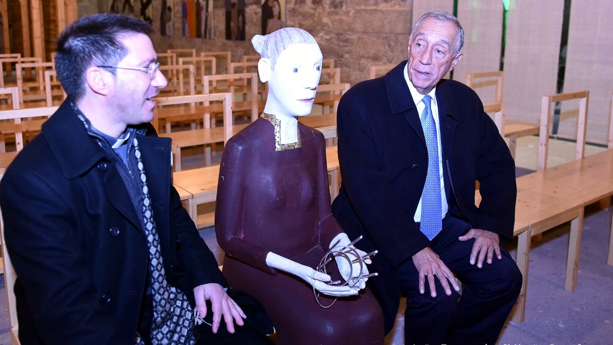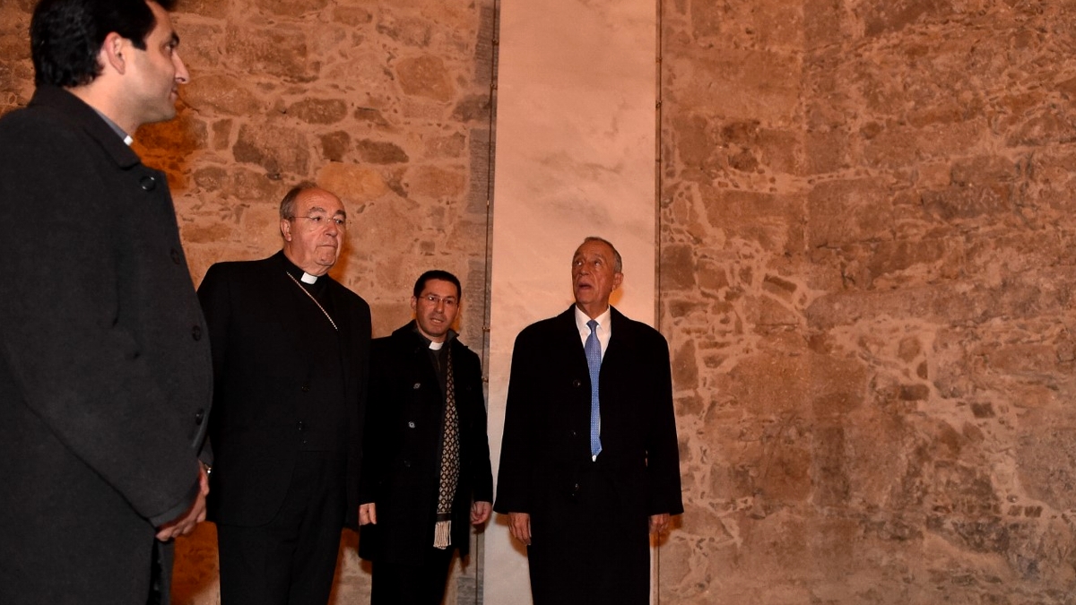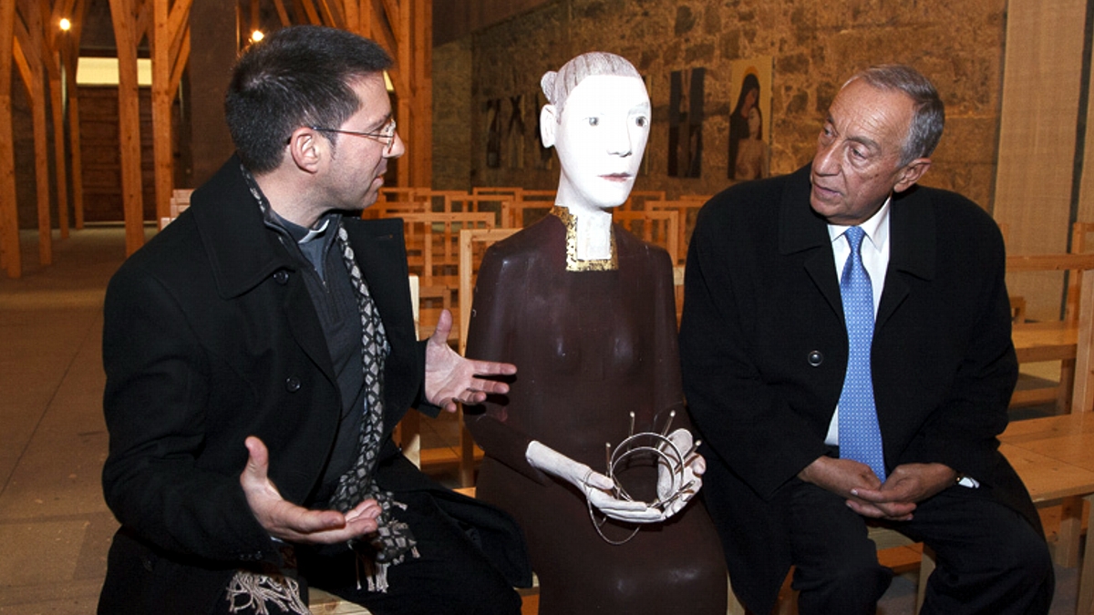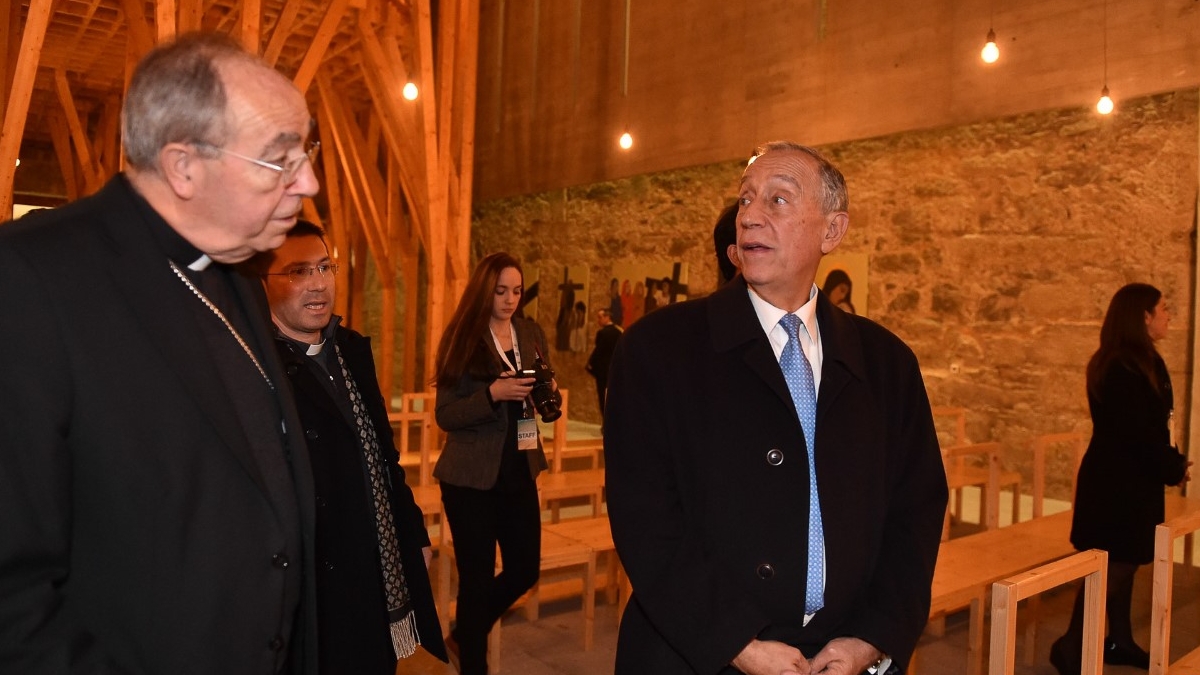 Em seguida, o Prof. Marcelo sentiu-se atraído pelo altar, donde se ouvia o rumor de águas vivas. E, enquanto para lá se deslocava, endereçou algumas palavras de estímulo ao Sr. Arcebispo, a quem muito elogiou pelo arrojo do espaço, nos seguintes termos: «Sr. Arcebispo, os estilos são para a frente!». Este otimismo que carateriza a fé dos cristãos, cuja missão é colocar eternidade no caminho das pessoas, levou-o a perguntar em seguida pelo sacrário, apresentado numa das reentrâncias laterais: obra em filigrana de madeira de tília, com uma árvore da vida em luz, na base, e duas águias esvoaçantes nas portadas, em cujo fecho foi esculpida uma cruz entre estrelas, motivo comum na arquitetura islâmica. Contemplado e tocado o altar, uma pedra em granito negro flutuando sobre água, voltou-se para a instalação Corpo de Luz, em mármore de Estremoz, para admirar a suspensão e a liberdade dessa obra de arte sem molduras, que ultrapassa a simbólica, Cristo ressuscitado que, concentrando a luz no seu corpo, enche de luminosidade todo o espaço.