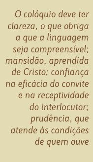 O colóquio é (...) [o] modo de exercer a missão apostólica, arte de comunicação espiritual. Os seus caracteres são os seguintes: l) Primeiro que tudo, a clareza. O diálogo supõe e exige compreensibilidade, é transfusão do pensamento, é estímulo do exercício das faculdades superiores do homem. Bastaria este seu título para o classificar entre os mais altos fenómenos da actividade e da cultura humana; e basta esta sua exigência inicial, para levar o nosso zelo apostólico a rever todas as formas da nossa linguagem: para examinar se ela é compreensível, popular e digna. 2) Outro carácter é a mansidão, aprendida na escola de Cristo, como Ele nos recomendou: "aprendei de mim que sou manso e humilde de coração" (Mt 11,29). O diálogo não é orgulhoso, não é pungente, não é ofensivo. A autoridade vem-lhe da verdade que expõe, da caridade que difunde, do exemplo que propõe; não é comando, não é imposição. O diálogo é pacífico, evita os modos violentos, é paciente e é generoso. 3) Outra característica é a confiança, tanto na eficácia da palavra-convite, como na receptividade do interlocutor. Produz confidências e amizade, enlaça os espíritos numa adesão mútua ao Bem, que exclui qualquer interesse egoísta. 4) E o último carácter é a prudência pedagógica, que atende muito às condições psicológicas e morais de quem ouve (cf. Mt 7,6): se criança, se inculto, indisposto, desconfiado e mesmo hostil. Essa prudência leva a tomarmos o pulso à sensibilidade alheia e a modificarmos as nossas pessoas e modos, para não sermos desagradáveis nem incompreensíveis.