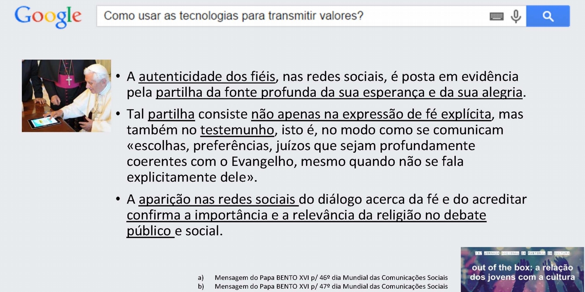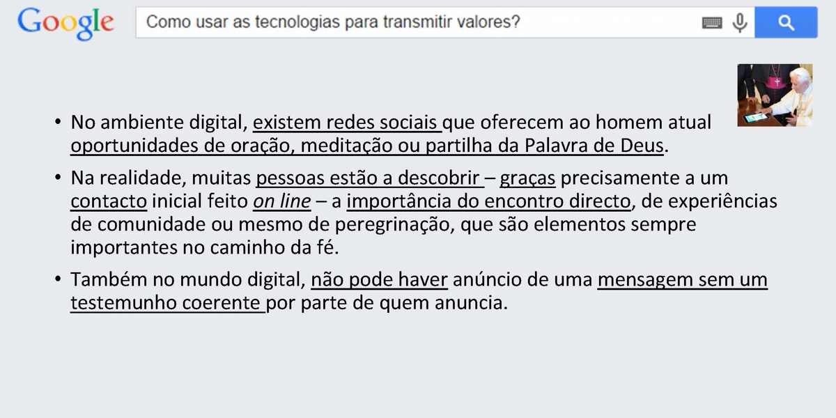 «As práticas culturais mudaram em função da tecnologia», experienciando-se «uma nova dimensão do tempo e do espaço», que recolocam a inquietação de saber como usar os meios de comunicação para «transmitir valores».