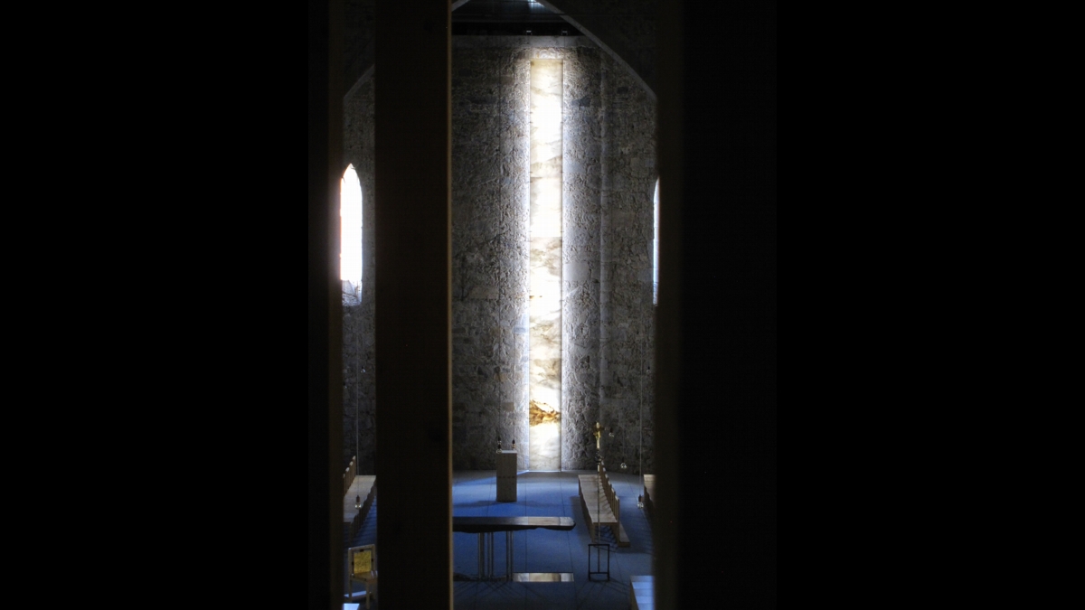 Ao observar mais de perto – os nossos olhos não captam de imediato estes «detalhes» de grande importância – esta luz apresenta-se dupla: numa primeira abordagem, ela é a luz do dia que surge de uma larga fenda vertical aberta na parede, mas esta luz parece iluminar o além-altar apenas lateralmente, já que uma ampla instalação se lhe interpõe. É preciso, então, que nos aproximemos para melhor captar a vasta folha de mármore, nervurada por numerosas impurezas que deixaram sobre a pedra a marca das imensas compressões que a produziram. A folha encontra-se elegantemente suspensa sobre o chão e é fina o suficiente para o mármore surgir luminoso, não opaco, nem translúcido, mas como se iluminado desde o interior, se bem que a pedra (cuja fixação vertical parece retirar-lhe o peso, tematizando-a como uma cortina religada às alturas pela sua suspensão mais do que pela carga ancorada ao chão pela força da gravidade) aparece como uma fonte que irradia a luz, não a difunde, à semelhança de um vitral (que deixa transparecer a luz exterior que o atravessa). Tal como um instrumento de música irradia o som que emite (o mesmo podendo ser dito de um altifalante que projeta o som em determinada direção), a pedra difunde a luz como um corpo irradia a sua energia interna.