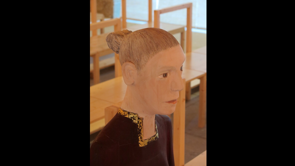 A estátua de uma mulher, à escala normal, tranquilamente sentada, com uma coroa nas mãos, como se pronta a transmiti-la ao seu interlocutor, está instalada na primeira fila de assentos dispostos na nave.