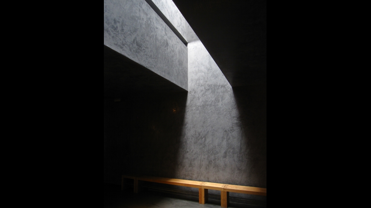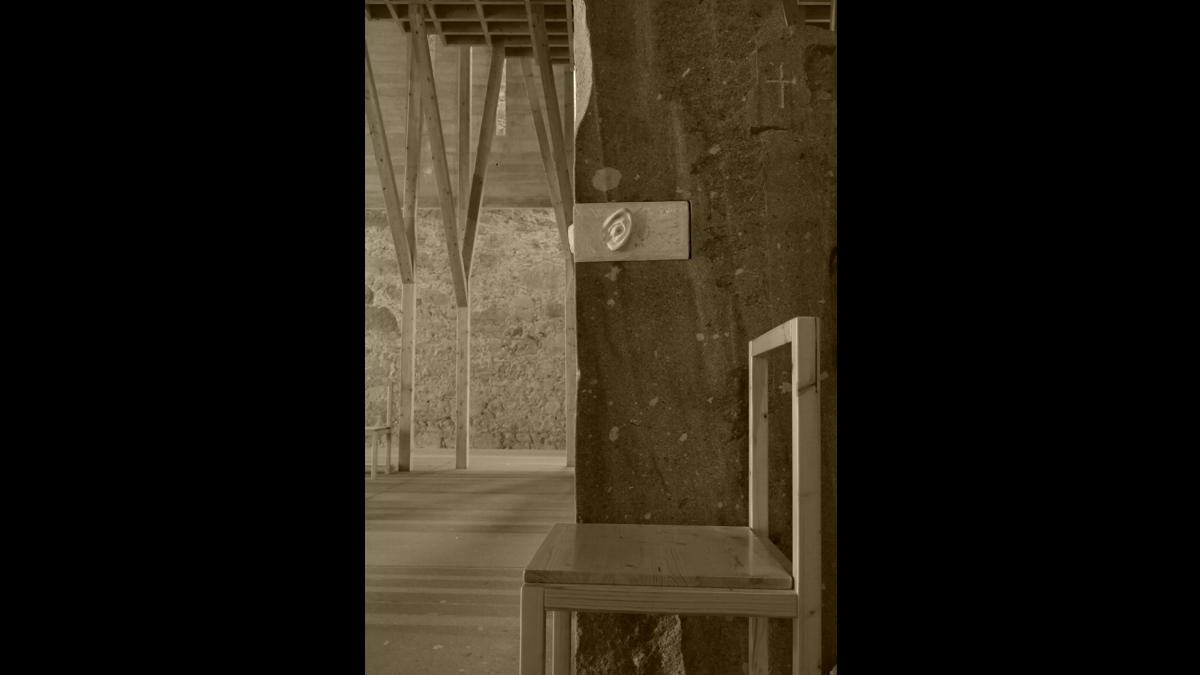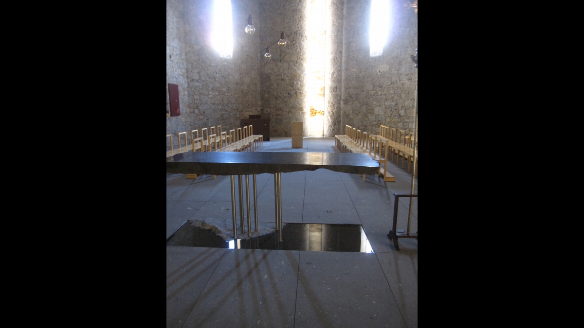 A superfície granítica, cuja horizontalidade é sublinhada pelos sete finos pilares de aço brilhante que a sustêm, é refletida no chão através de um pequeno recinto de águas vivas que, de um dos lados, deixa espaço para uma faixa de ‘terra-pedra’ que graciosamente introduz uma inclinação – a figuração do Jordão e da ligeira inclinação onde é possível banhar-se torna-se aqui evidente: é o baptismo que, descobrimos, sustém a pedra horizontal e escura da celebração e a faz cruzar-se com a pedra vertical de luz.