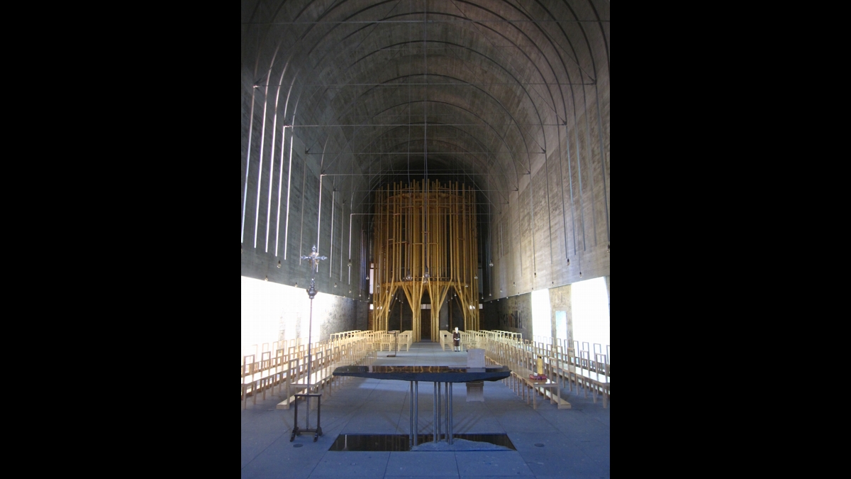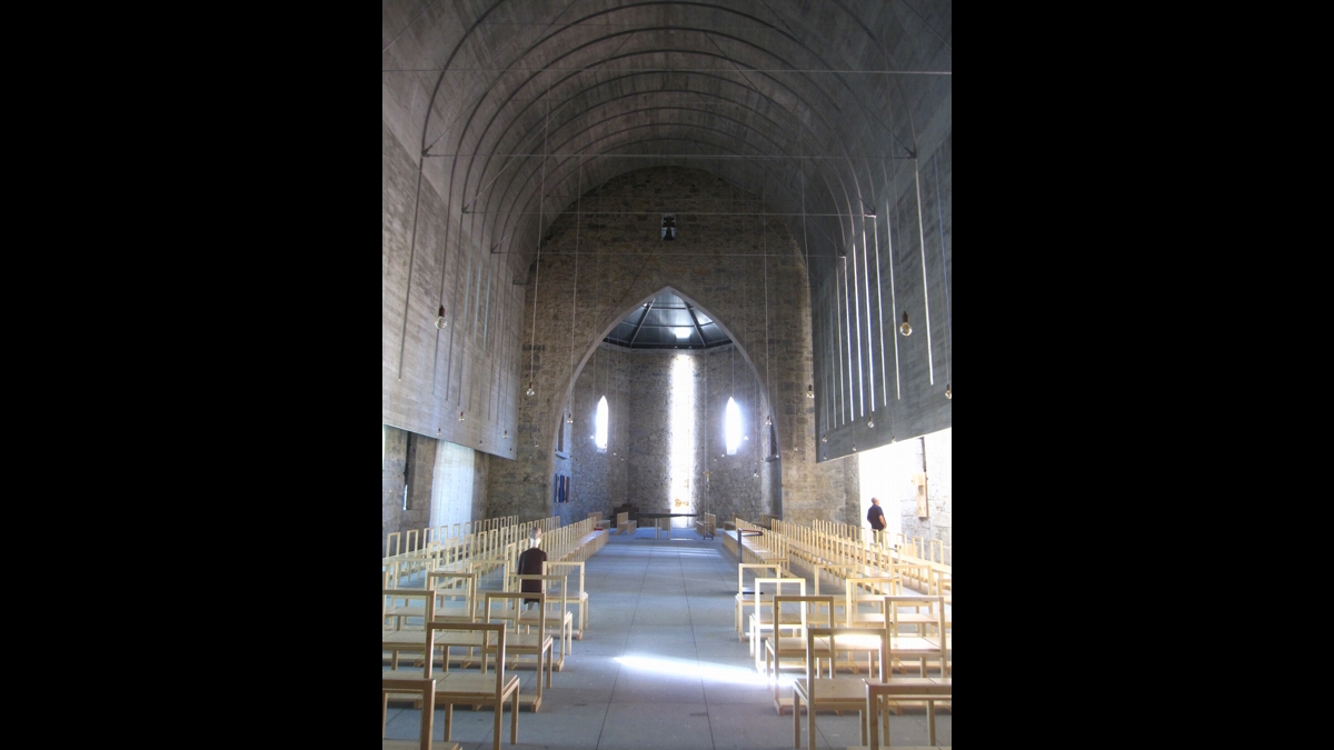 Dois invólucros: de um lado, uma vasta nave, estreitada por uma outra, suspensa e fixa naquela, para melhor a sustentar nos seus arcobotantes; do outro, uma pequena concha em madeira clara, qual arca de Noé em repouso no interior de um vasto paralelepípedo de pedra escura.