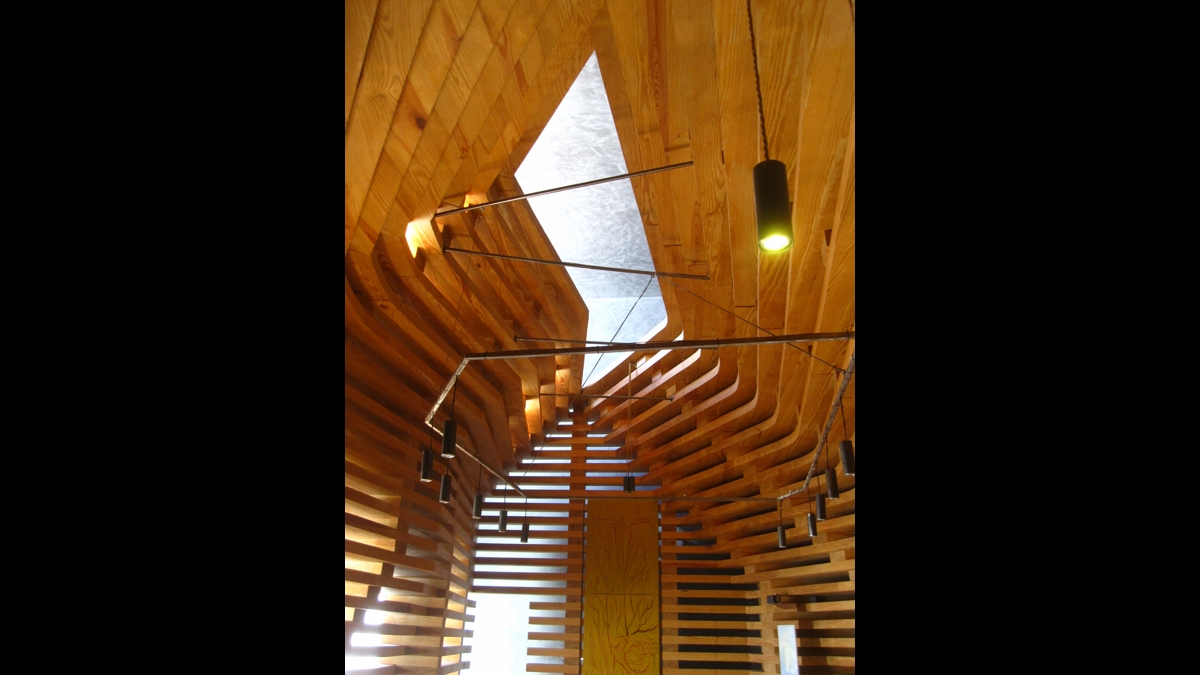 Uma prova prelimininar preside à introdução de cada um neste espaço, a qual acaba por filtrar o público de modo semelhante ao do conta-gotas: trata-se de uma floresta de finos pilares de madeira, que constitui, com efeito, a entrada da capela, pelo que aceder à nave implica percorrer um trajeto sinuoso que apenas cada um, na sua vez, pode realizar.