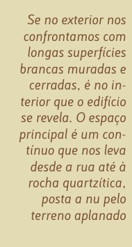 E se no exterior nos confrontamos com longas superfícies brancas muradas e cerradas, é no interior que o edifício se revela, como descreve o arquitecto. “O espaço principal é um contínuo que nos leva desde a rua até à rocha quartzítica, posta a nu pelo terreno aplanado. Primeiro, o pórtico de entrada. Depois o pátio-adro flanqueado pelas duas rampas e pelas alas onde se distribuem os centros comunitário e paroquial. Ao fundo, o espaço central da igreja, que um envidraçado torna inesperadamente transparente. Por último, o pátio exterior construído com a rocha existente, o ar, a luz zenital, água e plantas. Um espaço exterior aberto à contemplação”.
