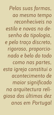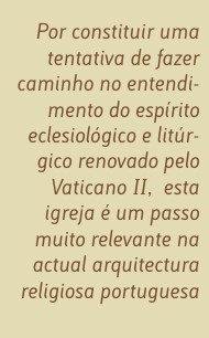 Cumpriu-se, então, o propósito do arquitecto: “A extrema simplicidade do espaço, da linguagem arquitectónica e do desenho dos objectos tem como objectivo a criação de um espaço de liberdade em que os protagonistas são as pessoas e os acontecimentos”. Esta é uma das maiores forças desta igreja: o modo como, sem perder identidade, se apaga para dar lugar e primazia à comunidade.