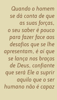 Esta “fé é uma confiança plena e absoluta em Deus”, segundo o padre Manuel Carlos, que a vê desenvolver-se “em termos mais genuínos e puros nos grandes apuros da vida”. “Quando o homem se dá conta de que as suas forças, o seu saber é pouco para fazer face aos desafios que se lhe apresentam, é aí que se lança nos braços de Deus, confiante que será Ele a suprir aquilo que o ser humano não é capaz”, explica.