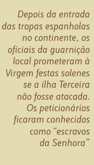 Mais tarde em 1762, depois da notícia da entrada das tropas espanholas em território continental português, os oficiais da guarnição local “prometeram à Virgem festas solenes se a ilha Terceira não fosse atacada”. Assinada a paz, os peticionários, que ficaram conhecidos como “escravos da Senhora”, lavraram um termo reafirmando aquele voto, em 11 de Setembro de 1764, “numa cerimónia solene e de elevada piedade”.