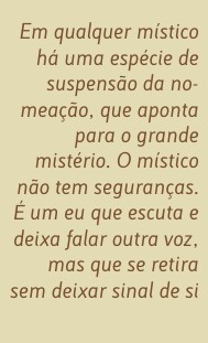 Em qualquer místico há uma espécie de suspensão da nomeação, que aponta para o grande mistério. Alguns, como por exemplo Teresa de Ávila, falam de um lugar ficcional, que se torna metáfora, alegoria do caminho da alma para o inominado. Nomear, numa linha judaica, é apropriar-se. O místico não tem seguranças. É um eu que escuta e deixa falar outra voz, mas que se retira sem deixar sinal de si.