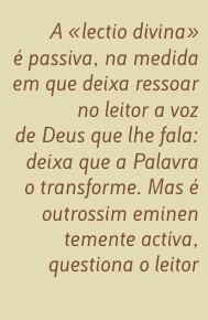 Portanto, a «lectio divina» é passiva, na medida em que deixa ressoar no leitor a voz de Deus que lhe fala: deixa que a Palavra o transforme. Mas é outrossim eminentemente activa, questiona o leitor: como é que a Palavra de Deus, que definitivamente é Jesus Cristo, espiritualmente presente na Escritura, fecunda o meu comportamento e o meu modo de pensar? Pela «lectio divina», o leitor torna-se “servidor da Palavra” e testemunha da sua força.