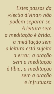 Meditar em silêncio com o texto [«Meditatio»], procurando o que ele quer dizer para mim, é fazer falar os seus silêncios; é actualizá-lo e assumir que ele tem a ver com a minha pessoa; é deixar-me agarrar por ele, vendo-o como vocacionado para resolver os meus problemas; é apropriar-me do texto até que ele, sem deixar de ser ele próprio, se torne espelho do meu ser e reflicta o que deve ser a minha vida. A meditação familiariza-me com o texto, até eu perceber que, através dessa palavra, Deus se quer comunicar a mim. Pela leitura, o leitor aplica-se todo ao texto; pela meditação, aplica a si todo o conteúdo do texto. A leitura assemelha-se à escavação arqueológica num monumento arquitectónico em busca da sua arte; a meditação aprofunda as implicações e consequências que essa arte tem na formação dos meus sentimentos. A leitura procura o antigo sentido do texto; a meditação aproxima esse sentido à minha vida, de modo a iluminar os meus passos hoje. A meditação é um acto da compreensão interior, a procura de mais verdade e a descoberta dos tesouros ocultos no texto.