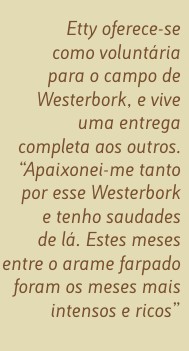 Perante a insistência dos seus amigos marxistas e trotskistas para entrar na clandestinidade, prefere continuar presente junto de quem precisa: “Não sinto que esteja nas garras de ninguém, só sinto estar nos braços de Deus”. Mas mantém uma relação muito forte e especial com a literatura. Quando parte para o campo afirma: “Quero memorizar uma coisa para os meus momentos mais difíceis e também a quero ter sempre à mão: que Dostoiewski passou quatro anos em desterro na Sibéria tendo a Bíblia por única leitura”. Mas leva ainda Rilke: “Cartas a um Jovem Poeta” e “Livro de Horas”. “Na realidade é um livro extremamente interessante, a Bíblia, violento e terno, ingénuo e sábio. Não só interessante pelo que lá vem dito, mas também para conhecer aqueles que o dizem”. De modo impressionante, sentimos que a poesia não se perde, antes se evidencia, criadora e animosa, no meio da violência e da provação. E Etty aparece como a eleita de Deus, sempre disponível para compreender o desafio do sofrimento e da tragédia, em nome da esperança que vai redobrando em importância e eficácia. E assim sentimos ao longo do diário a alternância entre a busca de um amor carnal, e a projecção espiritual dessa procura, com fidelidade à ideia de ressurreição. “Gostaria muito de viver como os lírios do campo”. “Vou ajudar-te, Deus, a não me abandonares”. “Se por causa do nosso ódio, nos transformamos em cães selvagens como eles, então já não faz diferença nenhuma”. “Prefiro ficar sozinha e estar disponível para todos”. “Faz então com que eu possa ser o coração pensante da barraca”. Afirmações como estas vão-se desdobrando, ao longo de intensas reflexões, numa constante luta, que se manifesta em alegria e disponibilidade.