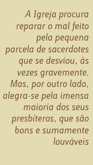 Vós, caros irmãos presbíteros, sois a grande riqueza, o dinamismo, a inspiração pastoral e missionária, lá na base, onde os nossos baptizados vivem em comunidade. Sem a vossa determinante decisão de remar mar adentro (“Duc in altum”) para a grande pesca, à qual o próprio Senhor vos convoca, pouco ou nada acontecerá no âmbito da missão urgente, seja «ad gentes», seja nos territórios de antiga evangelização. Mas a Igreja tem a certeza de poder contar convosco, porque sabe e reconhece explicitamente que a imensa maioria dos nossos sacerdotes, não obstante as fraquezas e limitações humanas, que todos temos, são sacerdotes dignos, que doam cada dia a sua vida ao Reino de Deus, que amam Jesus Cristo e o povo que lhes foi confiado, sacerdotes que se santificam no exercício diuturno do seu ministério, que perseveram até ao fim na messe do Senhor. Há, sim, uma pequena parcela de sacerdotes, que se desviou, às vezes muito gravemente. A Igreja procura reparar o mal feito por eles. Mas, por outro lado, alegra-se e orgulha-se da imensa maioria dos seus presbíteros, que são bons e sumamente louváveis. (...)"