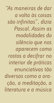 “As maneiras de dar a volta às coisas são infinitas”, dizia Pascal. Assim as modalidades do silêncio que nos aparecem como rostos a decifrar no interior de práticas enunciativas tão diversas como a oração, a meditação, a literatura e a música. Percorre-se aqui a forma que o silêncio reveste na literatura (M.G. Llansol, E. de Andrade, E. de Jesus, Celan) e no texto bíblico de Mc 14,3, partindo de um ponto de vista semiótico.