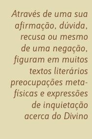 De modo sumário, este texto mostra como a humanidade, ao longo da História manteve viva a pergunta pelo sentido último da existência humana sobre a terra; como culturas e religiões foram dando respostas diversas a essa interrogação, tendo todas elas um carácter provisório enquanto resposta -- apesar da existência de revelações religiosas. Por isso essa interrogação fundamental continua a emergir, através de múltiplas vozes, em todos os tempos e lugares, dentro e fora dos quadros espirituais e religiosos existentes. A dimensão interrogativa quanto ao sentido último da vida parece assim surgir em modalidades diferenciadas em quase todos os contextos culturais do mundo. Por exemplo, a literatura, bem como outras formas de arte, é um dos espaços que incorpora essa busca do Invisível. Através de uma sua afirmação, dúvida, recusa ou mesmo de uma negação, figuram em muitos textos literários preocupações metafísicas e expressões de inquietação acerca do Divino. Em alguns exemplos, da poesia e da ficção narrativa do século XX e do XXI em Portugal, tenta-se observar os vários modos como a questão do Divino se inscreve.