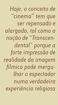 Com a descoberta do cinema no fim do século XIX, novas formas de representar e de exprimir o Religioso nasceram. A indústria cinematográfica percebeu rapidamente que o filme tinha o poder de atrair novas audiências e transformou a mensagem religiosa explícita num discurso teológico implícito no cinema de ficção. Hoje, o conceito de “cinema” tem que ser repensado e alargado, tal como a noção de “Transcendental” porque a forte impressão de realidade da imagem fílmica pode mergulhar o espectador numa verdadeira experiência religiosa. [Escrito em inglês]