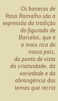 "A Sra. Rosa era uma personagem muito interessante. Era uma mulher do campo, igual a todas as outras, com uns olhos que não enganavam ninguém, e que eram absolutamente excepcionais de finura, de inteligência, de esperteza", diz Alves Costa, recordando que foi António Quadros quem retirou a arte e o nome daquela artesã do anonimato, depois de a ter visto, um dia, a fazer um boneco em barro com uma agilidade desconcertante, na feira das Fontainhas, no Porto. "Ele achou-o muito bonito - era um passarinho. Perguntou-lhe se ela fazia mais. Ela respondeu que tinha feito há muitos anos, mas que tinha deixado de fazer. Mas estava sempre a trabalhar o barro, porque lhe fazia bem à pele." O pintor desafiou-a, então, a fazer uma fornada, que ele compraria. Foi o início de uma relação que duraria anos, e foi também o começo da segunda fase da vida de Rosa Ramalho como barrista, depois de se ter dedicado ao trabalho de moleiro até à morte do marido.