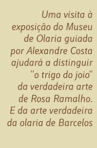 Uma visita à exposição do Museu de Olaria guiada por Alexandre Alves Costa ajudará a distinguir "o trigo do joio" da verdadeira arte de Rosa Ramalho. E da arte verdadeira da olaria de Barcelos.