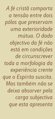 A fé cristã comporta a tensão entre dois pólos que preservam uma exterioridade mútua. O dado objectivo da fé não está em condições de circunscrever toda a morfologia da experiência crente que o Espírito suscita. Mas também não se deixa absorver pela carga subjectiva que esta apresenta. A única via para manter o elo, gerador de tensão, entre os dois pólos constitutivos da fé cristã é o discernimento. Só este consegue respeitar a natureza específica tanto da fides quae como da fides qua, considerando-as ligadas uma à outra. Sem a relação entre o dado objectivo da fé e o seu momento apropriativo, surgem perigos para ambos os pólos. Pelo lado da fides quae, pode chegar-se ao formalismo e ao moralismo. É o que aconteceria com uma intervenção do magistério desvinculada do sentido da fé protagonizado pela generalidade dos crentes. Pelo lado da fides qua, pode chegar-se a uma espécie de iluminismo ou de esoterismo. É o que esperaria provavelmente esse sentido, se não respeitasse a vigilância exercida pelo magistério.