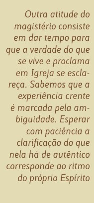 Outra atitude, que o magistério deve adoptar, consiste em dar tempo para que a verdade daquilo que se vive e proclama em Igreja se esclareça. Sabemos que a experiência crente é marcada pela ambiguidade. Esperar com paciência a clarificação do que nela há de autêntico corresponde ao ritmo do próprio Espírito que lavra no seu seio na direcção dos bons frutos. Esta atitude torna-se particularmente necessária no tratamento das questões morais, que tendem a suscitar grande polémica no contexto das nossas sociedades modernas. A vida conduzida à luz da fé cristã encarrega-se de apresentar problemas novos com que a Igreja pode não estar habituada a lidar. Convém permitir o debate e a reflexão, com a participação das vozes da consciência crente que surgem no espaço eclesial. As verdadeiras respostas às questões complexas elaboram-se, em princípio, num período alongado de tempo.