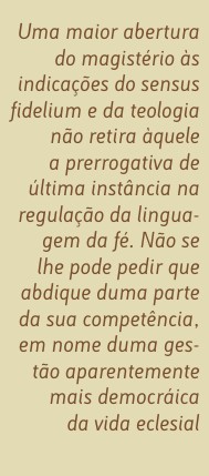 Uma maior abertura do magistério às indicações do sensus fidelium e da teologia não retira àquele a prerrogativa de última instância na regulação da linguagem da fé. Não se lhe pode pedir que abdique duma parte da sua competência, em nome duma gestão aparentemente mais democrática da vida eclesial. A descaracterização do papel do magistério poderia complicar até o contributo das outras funções para a dita regulação. Seria prejudicial para o conjunto da Igreja. Por isso, não se espera que aqueles que nesta têm a responsabilidade do ensino oficial se limitem a seguir as contribuições do sensus fidelium e da teologia. Mas pede-se-lhes que tenham estas em conta na sua actividade de supervisão da fé. A competência que eles exercem fica enriquecida com isso. Adquirem um maior conhecimento das questões sobre as quais se pronunciam. A voz do magistério ganha em autoridade face ao conjunto dos crentes. Dispõe dum acréscimo de elementos para emitir um juízo sobre o sentido da fé que aqueles revelam. Está em condições de o ratificar ou confrontar com mais pertinência. É certo que a atribuição dum espaço maior de palavra ao sentido da fé interfere no modo como o magistério se pronuncia a respeito dele. Mas essa palavra permanece sempre penúltima em relação ao juízo que este magistério emite.